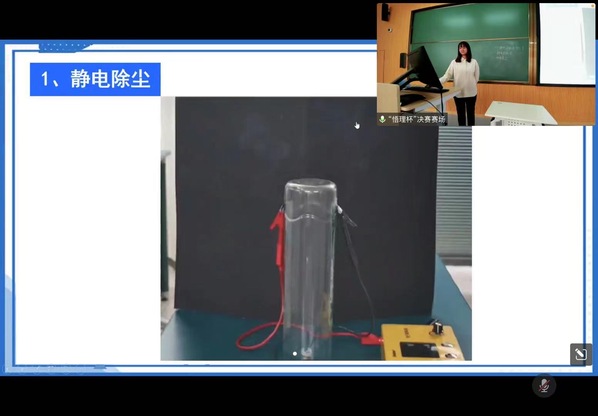 在《静电的利用与防范》赛题中,四位同学分别从不同的角度进行讲授。赵宇轩同学从冬天脱毛衣等现象入手引入本节课的知识点,并通过观看加油站起火的视频向同学们展示静电的危害;禄睿同学有条理、有逻辑地向同学们讲解了日常生活中与静电利用有关的三个实例:静电除尘、静电喷雾与静电复印,通过多媒体图示分析,讲解细致;潘宇婷同学从几个小的应用入手,讲解其背后的物理规律,特别是通过静电植绒等小实验,邀请同学们亲身体会并参与到实验中来,课堂氛围十分融洽,互动性极强;玉洪萍同学通过演示静电除尘的实验,带领同学们探究静电吸附的原理,语音语调自然。