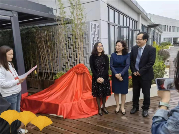 学院校友理事会副会长、苏州纽迈分析仪器股份有限公司董事长杨培强校友、苏州纽迈分析仪器股份有限公司副总经理李向红校友、物理与电子科学学院党委书记李恺共同为“物华石”揭牌。