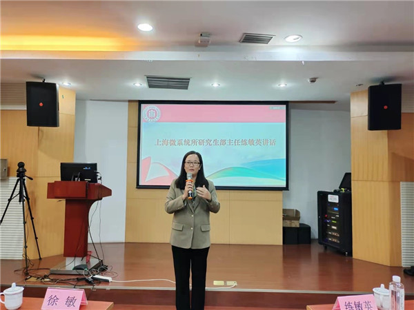 练敏英对中科院上海微系统所的历史沿革、科研条件、科研成就、文化传统作详细介绍。她谈起设立“上海微系统所奖学金”的缘起,并祝贺本次获奖的学生,希望能够更好地支持同学们完成学业。
