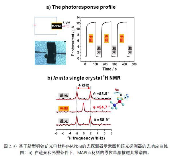 利用所研发的新型磁共振探测装置,姚叶锋团队对新型钙钛矿光电材料(MAPbI3)中Pb-I键受光激发导致的结构变化进行了原位观测。研究发现,在光照条件下,该类材料出现一种可逆的超慢晶体结构调整过程。该过程与这一材料宏观光电响应保持惊人的一致(图2a)。通过深入细致地研究,研究人员发现,MAPbI3中的MA阳离子(CH3NH3+)在光照诱导下会缓慢调整其在晶格中的取向(图2b)。而伴随着MA阳离子取向调整,材料晶格中的Pb-I键发生形变,进而导致材料带隙的减小和吸收系数的增加。上述发现建立了材料中分子层次的光诱导暂态变化与光电器件光响应的关联性,成功揭示了钙钛矿光电材料研究中长期未获理解的光电流稳定性之谜,为提升相关光学器件的光电流稳定性提供了全新的研究思路。